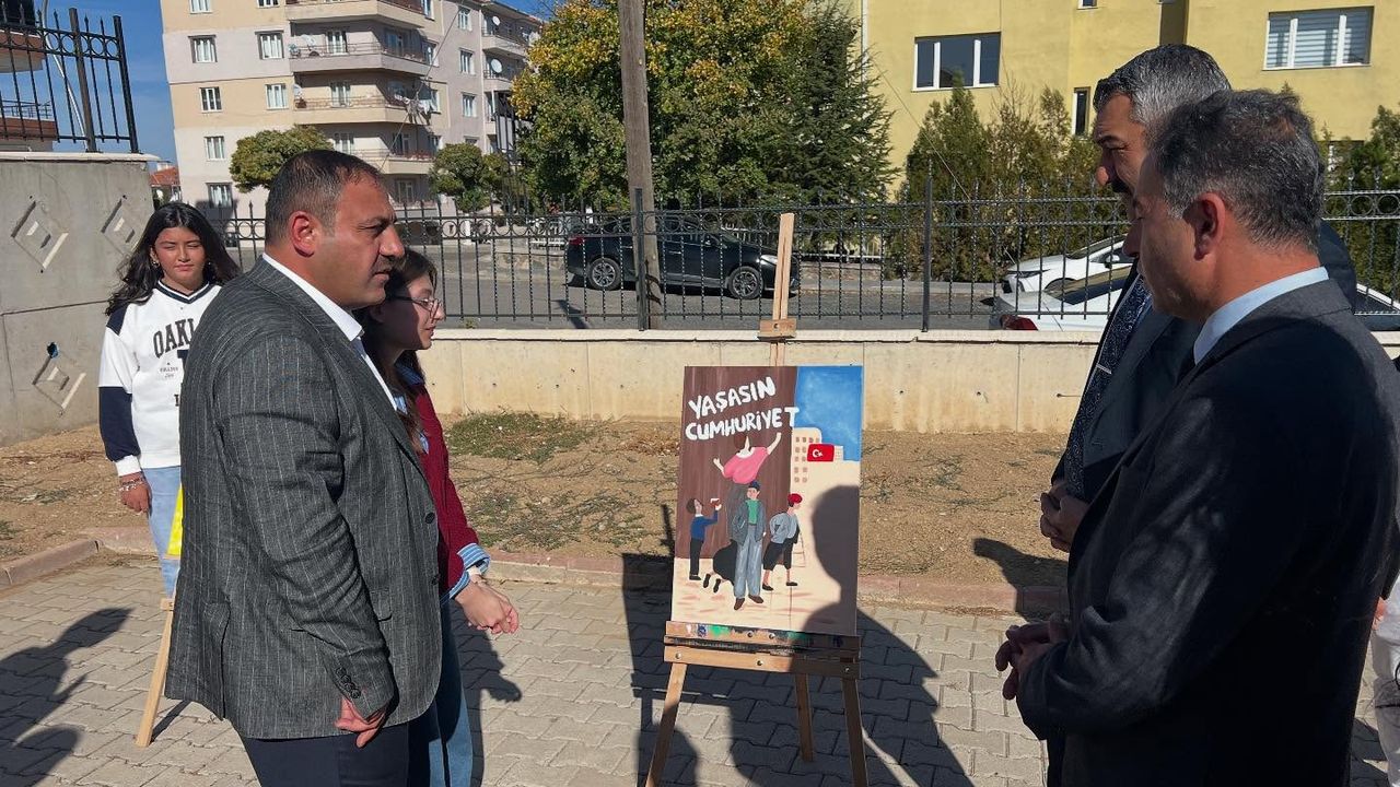 Sergide gençler, Cumhuriyetin değerlerini yansıtan resimlerini sergileyerek yeteneklerini ortaya koydu. Katılımcılar, eserlerin hazırlanmasında görev alan öğretmenlerle birlikte ziyaretçilere çalışmalarını anlattı.