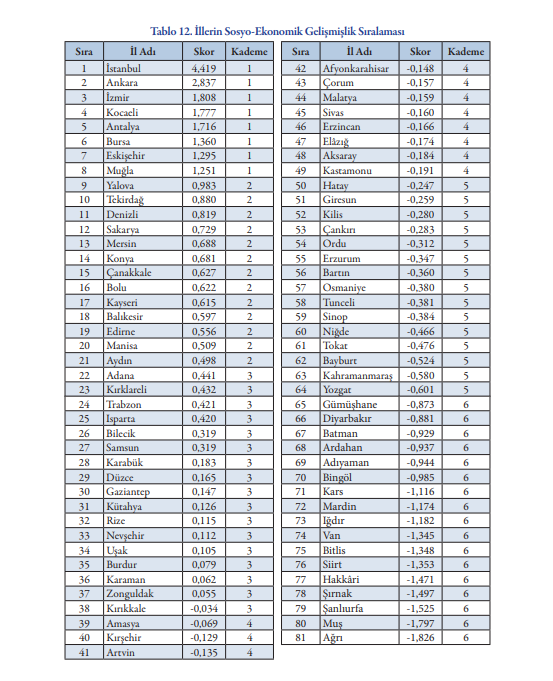 Raporda birinci gelişmişlik kademesinde İstanbul, Ankara, İzmir, Kocaeli, Antalya, Bursa, Eskişehir ve Muğla illeri yer aldı. Bu iller, 52 değişkenin büyük çoğunluğunda en yüksek performansı göstererek Türkiye’nin sosyo-ekonomik açıdan en güçlü bölgeleri olarak öne çıktı.
