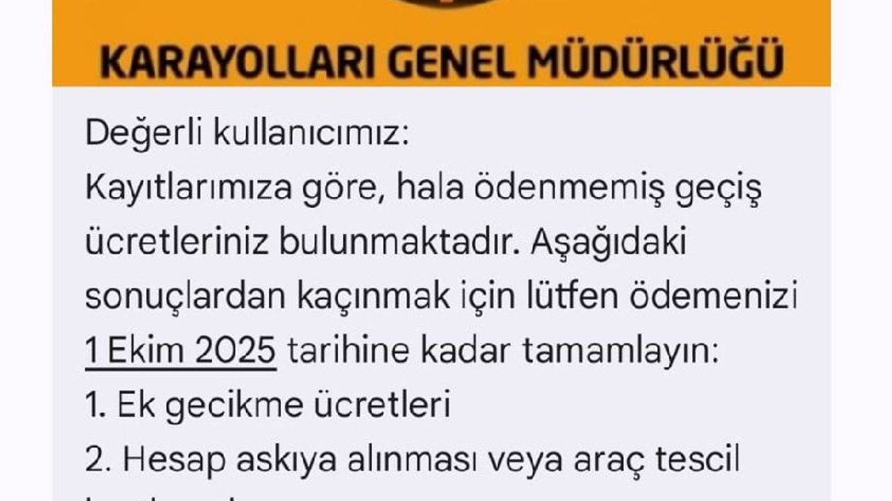 Kırşehir’de son günlerde, vatandaşlara Karayolları Genel Müdürlüğü (KGM) adıyla SMS yoluyla “ödemenizi 1 Ekim 2025 tarihine kadar yapın, aksi takdirde ek gecikme ücretleri, hesap askıya alınması veya kredi notu kesintileri olacak” şeklinde mesajlar ulaştığı bildirildi. Mesajlarda ayrıca sahte bir link verilerek vatandaşlardan ödeme yapılması isteniyor.