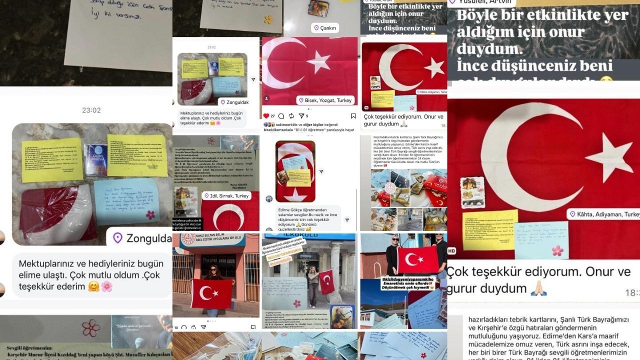 Kırşehir’in Mucur ilçesinde yer alan Kızıldağ Yeniyapan Şehit Muzaffer Kılıçaslan İmam Hatip Ortaokulu, 24 Kasım Öğretmenler Günü’nde Türkiye genelinde örnek bir çalışmaya imza attı. Okul yönetimi ve öğrenciler, Türkiye’nin 81 ilinde görev yapan öğretmenlere ulaşarak, özel olarak hazırladıkları tebrik kartpostallarını iletti. Kartpostallara eklenen Kırşehir’e özgü hediyeler ve Şanlı Türk Bayrağı, öğretmenlere unutulmaz bir sürpriz yaşattı.