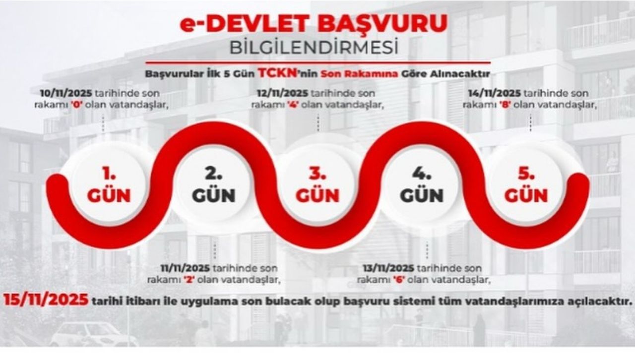 Konut başvuruları, T.C. Ziraat Bankası A.Ş., T. Halk Bankası A.Ş. ve T. Emlak Katılım Bankası A.Ş.’nin Türkiye genelindeki tüm şubeleri aracılığıyla gerçekleştirilebilecek. Ayrıca, e-Devlet üzerinden de başvuru yapılabilecek olup, başvurular 10 Kasım 2025 tarihinde başladı ve 19 Aralık 2025 tarihine kadar kabul edilecek. e-Devlet başvuruları ise 18 Aralık 2025 tarihinde sona erecek.